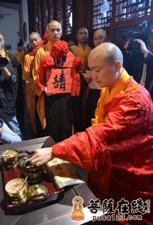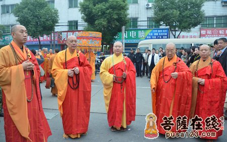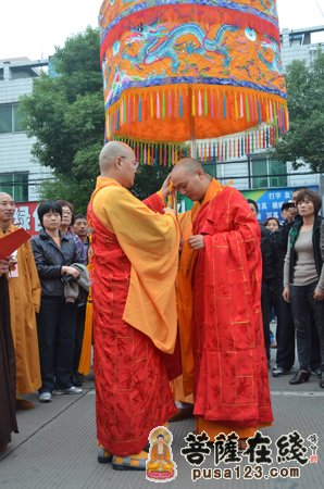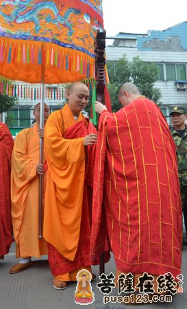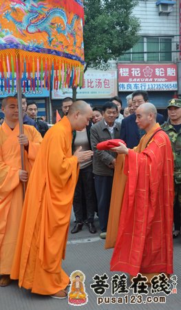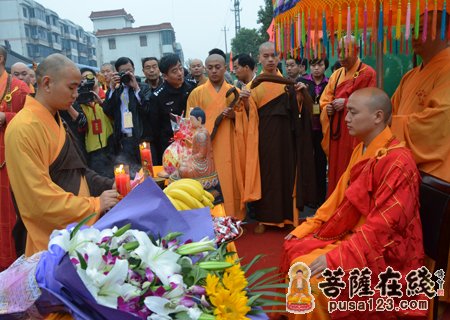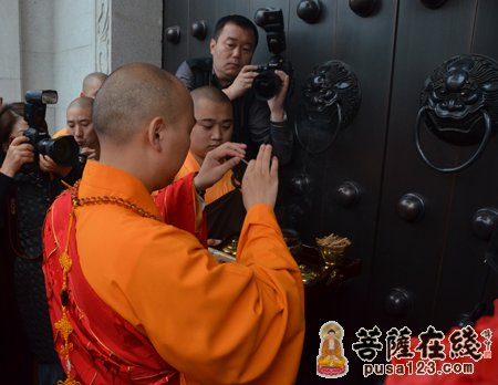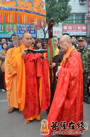 早晨7时。众高僧大德在山门前为法弘法师授衣、挂珠、授钵、授佛尘、授锡杖、授具、授如意。法弘法师振锡说法后,由诸山长老和贵宾护持,法弘法师亲启山门,缓步走入山门沿途信众纷纷鞠躬、合掌致敬。
