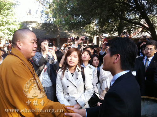 2011年10月15日,共青团中央国际联络部赵亚樵处长、河南省青年联合会王艺秘书长,带领以日本参公明党参议院议员石川博崇为团长的日本青少年友好使者代表团及青少年工作者,共一百二十余人参访少林寺。少林寺方丈释永信热情地接待了这些远到而来的朋友。