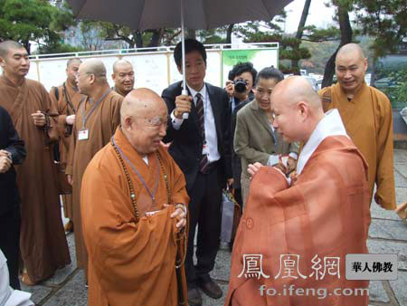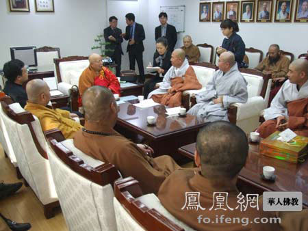 中国佛教代表团团长传印长老率团拜访曹溪宗,受到宗会议长普善长老的热情接待。(图片来源:凤凰网华人佛教 摄影:陈星桥)