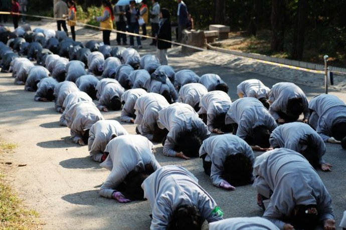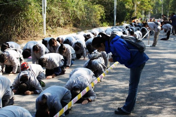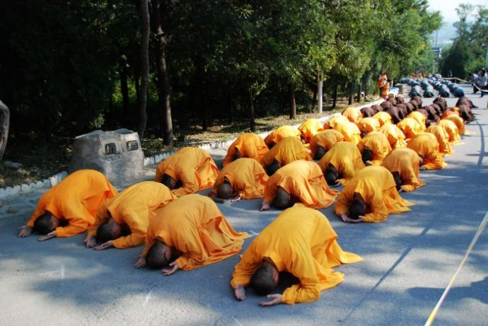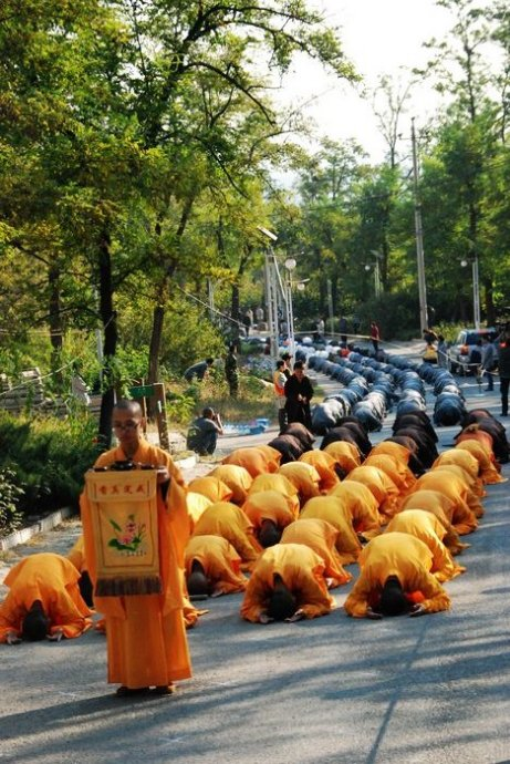 国庆黄金周佛教文化系列活动接近尾声了,最后一项集体活动“朝山礼佛”将法会推向了高潮! 早上八点,凤凰岭公园内主公路上,法师及学员、义工排列长长的队伍,伴随着佛号,缓缓向着寺院的山门礼拜。 在朝山礼佛开始之前,贤立法师提策大家,应该以皈依、祈求、忏悔的心情去礼佛朝拜。 三宝就是我们生命中最值得信赖的依靠,最值得信仰的依靠,他无时无刻不在帮助我们。 佛的法身遍满虚空,超越时空。 我们看到佛像,面对着佛像礼拜的时候,观想佛就是真实的佛; 没有面对佛像的时候,我们心里忆念到佛,实际上就如同佛在我们面前。 只要有虔诚的心,赤诚的心,就能得到佛菩萨的帮助,就能得到佛菩萨的加持。 全身心地相信三宝能够真正帮助我们、真正能够救助我们,把我们从苦海中拔济出来。 祈求佛菩萨、三宝能够加持我们,让我们建立起崇高的人生目标,让我们真正认识生命的意义和价值,让我们能够过一个有意义的人生。 祈求三宝加持,能够消除我们内心的种种障碍,消除我们生活中种种的不如意,能够净化我们内在的心灵,提升我们内在的觉悟和智慧。 至诚的祈求对我们非常有帮助。 佛菩萨的功德、佛菩萨对众生利益的能力是无限的存在,我们能得到多少的帮助,得到多大的利益,在于我们内心能够启发多少祈求的心、虔诚的心。 忏悔业障,一个是我们外在的,我们过去无知,所造的种种的杀盗淫妄,对众生种种的伤害,特别要去忏悔。 我们现世的身体病痛、事业不顺利、乃至于生活当中人与人相处的种种困扰,实际都是我们过去、乃至于现在,由于无知所造下的业,感得的果。 所以要认真地去反省、忏悔。忏悔后会有直接的感应,身体会轻松,心灵会解脱。 更深一层的忏悔,忏悔我们内心的无明,忏悔我们因为无知,所以才会造这么多的业; 忏悔我们不了解佛法,不知道因果、不相信因果; 忏悔我们自私自利的习气,只知道自己。因为对自我的执取,所以让我们造了种种的业。 祈求三宝加持,佛菩萨加持,能够真正让我们的生命觉悟起来。 带着殷切的叮咛,朝拜队伍中的法师们穿着明黄色的海青,走在前面,紧跟其后的学员和义工也队列整齐,随着佛号声与法师们一起三步一拜,庄严而神圣。 公路侧边的游客,有的停下脚步,默默注视着这支特别的队伍;有的游客也加入到朝拜的队伍中来。 本以为经过昨天的皈依、传灯活动,眼泪已经流尽,可真正参与到朝圣的队伍中,又是全新的一番感受! 在朝山的整个过程中,点点滴滴都有其深刻的意义。 当开始排班等候时,后面的同修不知道前面的状况,部分人就开始你一言我一语,场面有点嘈杂,就像无明的我们过着盲目的生活。 当护持的义工耐心疏导,队伍逐渐变得有序。就像我们很幸运能够在盲目的人生旅途中,听闻佛法,开始有希望的人生。 礼拜开始,随着佛号声一步步前行,就像我们在佛法的指导下一步步地踏实生活。闻磬声拜,闻磬声起,需要我们踏实地觉知当下每个念头,走好每一步。 当我们妄念纷飞、思路走神,磬声都敲过了,还没俯身下拜的时候,同行的行动提醒着我们,自己错了,赶快改过。恰如在修行的过程中,无量的贪嗔痴慢疑覆盖着我们的心灵,同行善友们及时提醒和帮助,让我们及时终止错误的行为,走上正确的菩提大道。 朝山的路上,阳光强烈,有些人渴得很,有些人体力不支,有些人手脚疼痛……出现各种问题。这时,护持的义工,及时送上水、送上食物,体力不支的人得到及时的照顾。就像我们的僧宝,一路陪伴着我们,帮我们度过种种难关,达到彼岸。 一路走来,发现有时太阳当头晒着,有时是有树荫庇护;脚下的路有时平坦,有时碎石很多。不正像我们的修行之路,有时平坦、有时坎坷;有顺境,也有逆境。只有经历不同的情境,才能真正磨炼我们的这颗心,让他坚强有力! 整个朝山活动,虽然知道目标就在山门,不过拜到一半,还是没有看到山门,跪拜的膝盖有些疼痛,内心也就有点焦躁。不断响起的佛号,身边同修静静的跪拜,不时还看到前面飘动的明黄色海青,心中逐渐又安定下来。 尽管修行的路途遥远,但我们一步一个脚印,跟随和合的师法友团队,依教奉行,如理修习,相信未来我们一定可以安全到达目的地! 不断地跪拜,不断地跪拜,…… 心里充满了感恩和感动,眼泪止不住地流下来。 我们要不断地去努力,去进步,去净化,去提升自己内在的智慧和觉悟; 让生命散发光彩,去照耀更多的人,启发更多的人,帮助更多的人。 学习佛法,实践佛法,改善自己的人生,改变我们无明的状态,最后像佛菩萨、像圣者一样,觉悟圆满!这样我们才能越来越快乐,给众生带来巨大的利益。