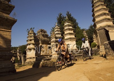 2011年10月6日,在河南嵩山少林寺,黑龙江省铁力市崇圣讲寺住持果悟法师师徒两人骑单车前往广东韶关大觉禅寺时,途径少林寺塔林。