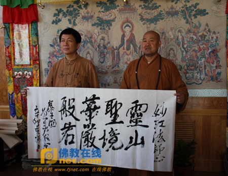 妙江法师和曾春朝理事长在竹林寺上客堂进行了亲切座谈。妙江法师对曾春朝理事长的到访表示欢迎,曾春朝理事长向妙江法师介绍了泰国佛教界的近况,并表示自己此次是首次到五台山,可谓法缘殊胜。妙江法师在座谈中回顾了早些年为泰国僧王祝寿时与僧王的友谊,并表示曾春朝理事长不远万里从泰国到五台山参访,足见其心之虔诚,佛缘之深厚,令人慨叹。随后,曾春朝理事长现场挥笔泼墨写下“灵山圣境、华严般若”的偈子赠予妙江法师;妙江法师则以墨宝“得佛智慧”回赠曾春朝理事长一行。