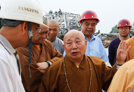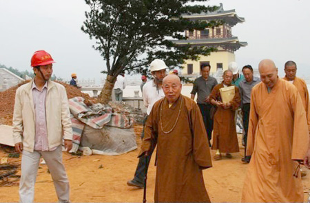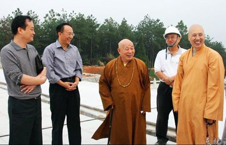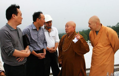 中国佛教协会会长、江西庐山东林寺方丈传印长老到东林大佛工地视察(图:东林寺)