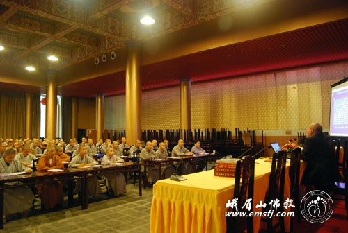 当天下午,讲座在峨眉讲堂内举行,强梵畅教授结合自己的修禅经历,用精炼直白的语言为在场师僧讲解了《禅关策要》的禅修要旨,同时不忘强调实修的重要,可谓直击要害,令闻听者咸获法益。