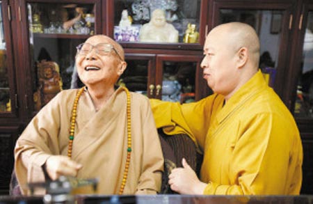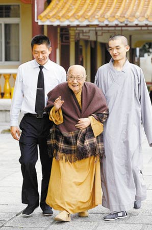 虽然平时一副“老顽童”的做派,可念佛修行的时候老和尚则一丝不苟。除了朝晚诵读自己当年刺血而成的血经《大方广佛华严经普贤菩萨行愿品》之外,老和尚每日三餐后必围绕方丈室客厅一边散步一边认真地礼佛。当意外发现记者在“偷拍”时,他假装生气地嗔怪道:“这你也要拍?拍得不好看可不能见报哦。”幽默风趣一如往常。