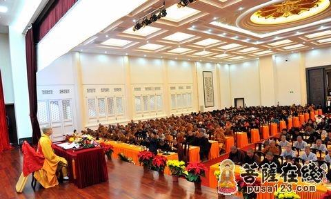 下午14时,僧俗四众近500人云集普门讲堂,有序就位,对面合掌,恭迎讲经法师。能进法师由仪仗队迎请步入讲堂,拈香礼佛后高登法座,维那师呼钟声偈:“钟声传三千界内,佛法扬万亿国中,功勋祈世界和平,利益报檀那厚德。”