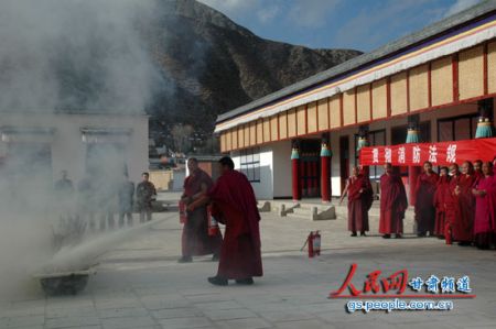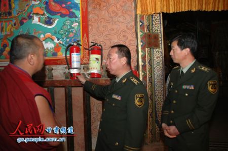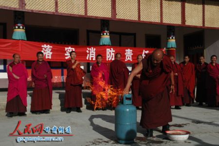 甘南州是著名藏传佛教圣地,全州共有寺院121所,建筑大多都是木质结构,广大僧人多在寺院内食宿,存在较大的火灾隐患。1994年的卓尼县禅定寺火灾,1985年拉卜楞寺火灾曾使大量的民族文物和佛教艺术珍品毁于一旦。“清剿火患”战役打响以来,甘南州消防支队与州内所有寺院签订了《消防安全责任书》,指导他们建立了消防安全管理制度,全州所有寺院均建立起了义务消防队。在2011年的“119”宣传期间,针对寺院火灾特点和防火、灭火实际情况,消防官兵从寺庙土木结构、耐火等级低,交通不便、水源不足等方面向僧人们详细讲解了寺庙火灾危险性,并印制了两万余份藏汉双文《寺院消防常识问答》、《寺院防火手册》、《藏式寺院防火常识》等消防工作手册免费发放到各寺院,全州共组织僧人开展火场逃生自救、油盆灭火实战演练56次,有效提高了寺院僧人火场逃生和初起火灾补救能力。