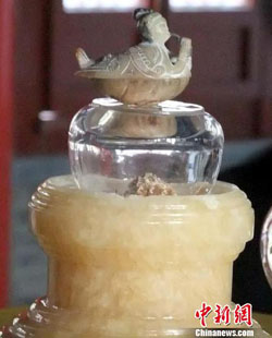 14日下午,据称是中国惟一有文献记载的释迦牟尼佛骨舍利在河南嵩山大法王寺首露真容。当地媒体记者及部分信众观瞻了这一佛教圣物。