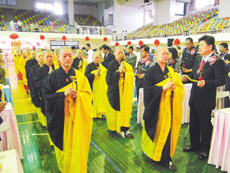 花莲县政府举办“台湾各宗教花莲祭天为民祈福暨绕境”活动,佛教界人士昨天群聚花莲市花岗山中正体育馆,在庄严的三宝歌声中,县长傅崐萁等人行礼如仪,期盼国泰民安。花莲县佛教会配合县政府举办“建国百年宗教系列庆祝活动”,前理事长祥德寺住持地皎导师,嘱咐也是前理事长的觉光法师带领100多位出家师父,全力协助现任理事长会果法师,参与县政府举办的活动。由佛教会统筹设计,各寺认购,佛教会暨所属各大寺院团体融为一体,是宗教界的大团结,即日起至12月3日展开系列“宗教嘉年华”祈福,包括配合全县各乡镇市规划路线一连多天的花车动态绕境活动。法会在恭颂三宝歌声中揭开序幕,由法师们带领大家恭颂“仁王护国经”和“梁皇宝忏”,阐扬佛陀慈悲喜舍精神,并为世人祈福,愿众生早日离苦得乐,全体来宾将功德圆满回向、远离灾祸,场面庄严。法会请来佛教会前两任理事长地皎法师、觉光法师与理事长会果法师领众祈福,傅崐萁、徐榛蔚夫妇、县议长杨文值、新城乡长钱自立等多人参与,各大佛教法师、信众及社团代表均与会,共沾法益。傅崐萁感谢佛教界法师和信众们虔诚与会,花莲多次受到上苍庇佑,躲过一连串的风灾,他心中一直有个理想,希望由花莲做起,广纳各宗教文化传递祥和,达到风起草偃之效,让观光大县的花莲成为真正的宗教灵修圣地。法会在庄严肃穆的梵音声中进行,会场特别设置许愿墙,欢迎民众前来许善愿、敲吉祥钟。