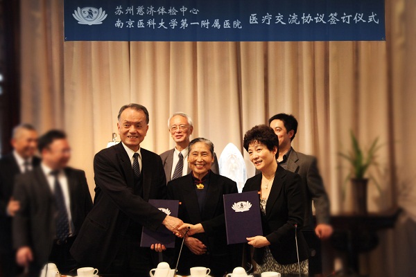 2011年11月18日,慈济苏州门诊部与南京医科大学开展医疗合作,并举行签约仪式。座落于苏州古城的静思书院及来书院参加仪式的各位嘉宾共同见证了这一时刻。慈济基金会副总执行长林碧玉女士主持签约仪式,慈济医疗志业林俊龙执行长,江苏省人医王虹院长作为两院代表在医疗主管部门的见证下共同签署合作协议。