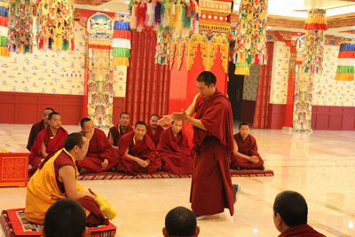 辩经是藏传佛教传统的佛学升位方式。出家人学习佛经后,为了加强对佛经的真正理解,采用一问一答,一问几答或几问一答的辩经方式来交流所学心得和所悟佛法。提问者在考场来回走动,就他想到的有关问题即兴向考僧提问;考僧则坐于蒲团上,就这些问题进行回答。