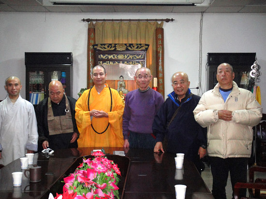 座谈中宽容法师向大岳正泰一行介绍了三祖寺正在建设中的二期工程,并展示了三祖寺规划蓝图。双方并就中国寺院的建设进行了交流。最后宽容法师向客人们赠送了礼品,并合影留念。