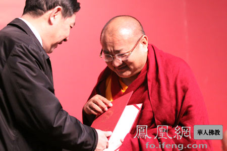 中国人民大学副校长杨慧林教授向藏传佛教格鲁派高僧夏坝仁波切颁发了“中国人民大学董事会董事”证书。(图片来源:凤凰网华人佛教 摄影:丹珍旺姆)