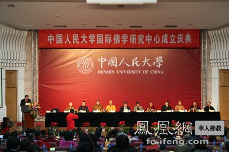 凤凰网华人佛教北京讯:2011年11月14日,中国人民大学国际佛学研究中心成立典礼暨首届国际佛学论坛“经典翻译与宗教传播”在中国人民大学逸夫会议中心举行。全国政协委员、中国佛教协会副会长、第十一世班禅额尔德尼大师为中心题写了藏文名称,这是班禅大师第一次为机构题名。著名佛教学家、中国人民大学方立天教授为中心题写了汉文名称。原全国人大副委员长许嘉璐先生发来贺电,向中国人民大学国际佛学研究中心成立表示热烈的祝贺。