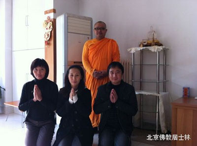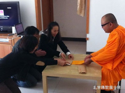 11月14日下午,北京佛教居士林吴炎主任和申竞、赵倩两位义工,来到泰国法身寺圆觉法师北京住处,将募到的用爱心汇集的水灾救助款送到法师手中,并转达了居士林信众对泰国人民的关心。