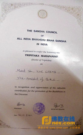 学诚法师荣获全印比丘僧伽会三藏大法师博士学位