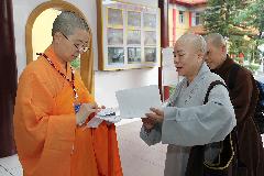 在报到处,有些新戒由自己道场的师父、师兄陪同报到,场面温馨。随後一一入堂面试审核,新戒们端身敬受问话,希望戒师给予自己入坛受戒的机会。下午编班时,开堂和尚尼永富法师问新戒:“你准备好了吗?”她勉励大家要庄严起自己准备受戒的心态,在戒期中好好学习细微的行仪,从戒师的教导中,用心领受,内化出柔软、慈悲。