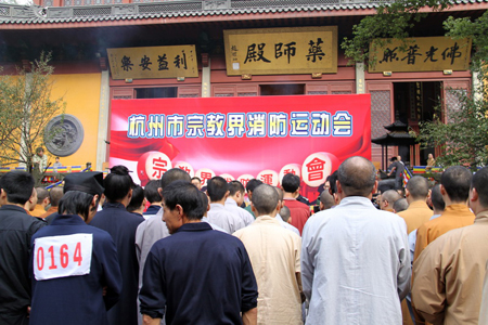 2011年11月4日上午9点,江苏省杭州市宗教界消防运动会在灵隐寺举行。由全市佛教、道教界派出的12个代表队近70名运动员,分别参加100米负重跑、二人百米接力操、着装救人出水操、利用室外消火栓快速出水灭火操及消防综合知识竞赛等5个项目的激烈角逐。佛教、道教、基督教、天主教、伊斯兰教五大教派的信众、佛学院学生及现场游客等到场观摩。