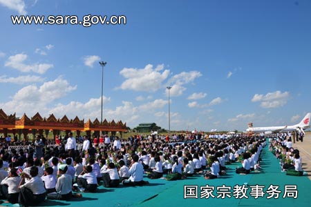 缅甸时间2011年11月6日13时,载着中国佛牙舍利的包机顺利抵达缅甸首都内比都,缅方在机场举行了盛大的欢迎仪式,现场搭建了彩棚,布置了彩车,举行了庄严隆重的佛事活动,副总统赛茂康率宗教部、文化部等多部门负责人在机场迎候,来自社会各界的2550名群众列队,迎奉现场彩旗招展,一片欢腾,盛况空前。