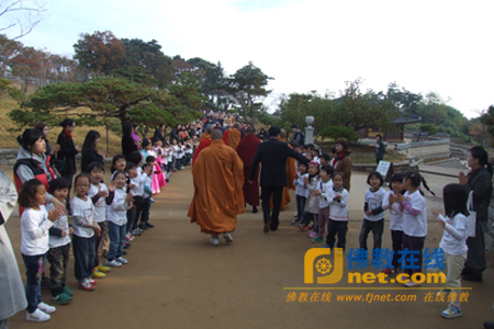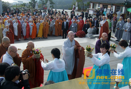 中韩日三国佛教代表到达观音菩萨道场洛山寺参加祈祷世界和平法会,受到广大信众热烈欢迎