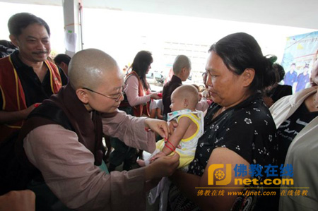 11月24日,洞音法师及泰国讲堂执事法湛法师会同志工一行16人,搭乘僧王寺的赈灾专车行列,前往曼谷西郊暖武里府(Notha-Brui)多处的收容所、寺庙等进行物资的发放。志工一行人到达收容所后,接力传送爱心包,将一包一包的爱心送至灾民手中。灵鹫山的法师更为大家送上开山心道法师的祝福红线,希望给灾民更多的平安。