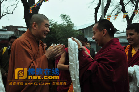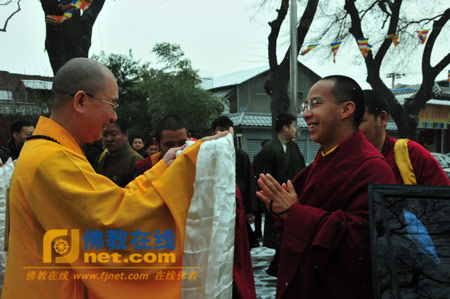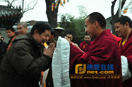 中国佛教协会副会长、中国佛学院常务副院长湛如法师向第十一世班禅大师敬献哈达