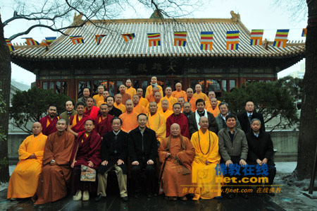 2011年12月29日上午,第十一世班禅额尔德尼却吉杰布大师拜会中国佛教协会,在钟鼓齐鸣的法乐当中,受到中国佛教协会会长传印长老、副会长学诚法师、湛如法师,秘书长王健,广济寺方丈演觉法师以及中佛协各部室负责人和广济寺僧众的热烈欢迎。