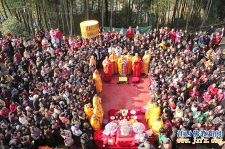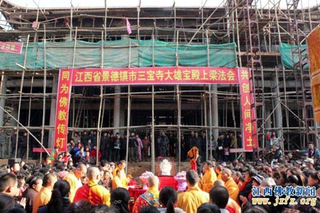 2011年12月9日上午,江西省景德镇三宝寺隆重举行大雄宝殿上梁庆典法会。江西省佛教协会会长纯一法师和景德镇市佛教协会副会长无非法师、三宝寺住持果悦法师为上梁法会主法,四众弟子1000余人参加。