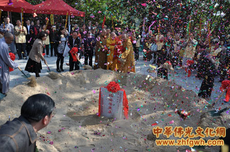 到达现场的庆贺的嘉宾包括荔湾区统战部的领导、区民族宗教事务部的领导、省佛教协会会长释耀智法师、年过九旬的海幢寺住持释新成长老,慈善家周仕伦等各界名人。福胜庵住持释光玉他台上致辞。随后,各位领导及法师在现场进行了培土奠基仪式。
