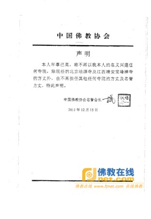 2011年12月15日,中国佛教协会名誉会长一诚长老发表声明。全文内容如下: