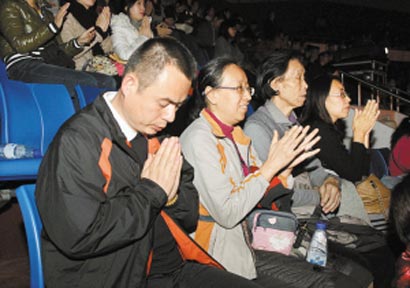 坐在体育馆红区的祖孙三代特别引人注目。他们是从南山赶来的郑老爷子一家。“热线领票电话一公布,我就叫孙子领了6张票,老早就想着能见见高僧,听听他们的话了。”头发已经斑白的郑老爷子说。