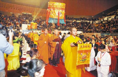 12月21日下午,记者到深圳体育馆听佛学文化讲座,到笋岗路时,路面开始塞车。许多人摇下玻璃窗问:“出什么事了?来了大明星了?”记者听着好笑,告诉他们:“来的不是大明星,是大和尚。”众人不解,记者答曰:“是的,人们有心病,需要救治。”