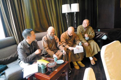 在讲座间隙,晶报记者习风与高僧大德交谈。(图片来源:晶报)