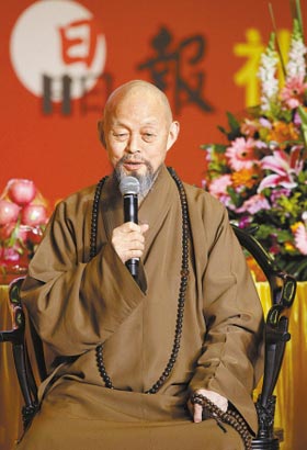 在众僧环坐的莲花台中,净慧长老作开示。(图片来源:晶报)