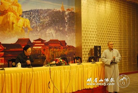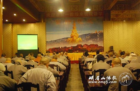 2011年12月25日上午,四川峨眉山大佛禅院峨眉讲堂举办题为《中国宗教人生智慧》的佛学讲座。中国宗教学会理事、《宗教学研究》副主编、四川大学宗教学博士生导师、四川大学公共管理学院院长潘显一教授应邀做主讲。讲座由四川峨眉山佛学院副院长满霖法师主持,四川峨眉山佛学院的法师、任课教师、学僧和全山寺院的部分法师现场聆听讲座。