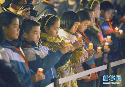 南京佛教界人士、部分小学师生代表、南京大屠杀史研究人员和来自韩国、日本的国际友人在南京举行烛光祭,悼念南京大屠杀30万同胞遇难74周年。