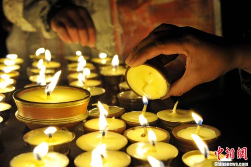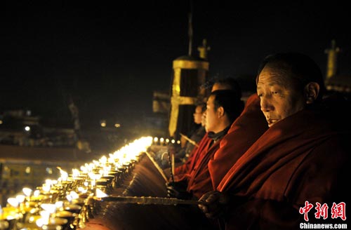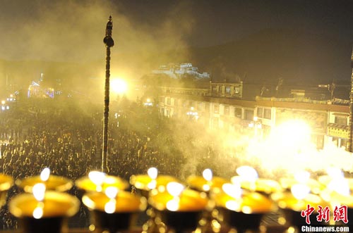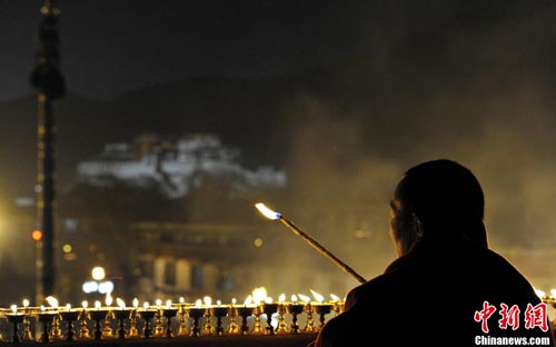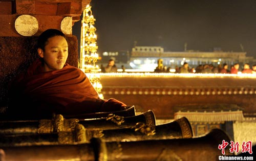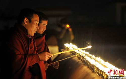 2011年12月20日晚,西藏拉萨大昭寺内灯光闪烁,人头攒动,锣号齐鸣。是日为藏历十月二十五日,称为“甘丹阿曲”,又名燃灯节,是纪念藏传佛教格鲁派创始人宗喀巴圆寂的日子。