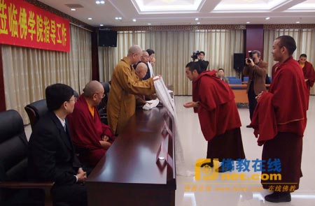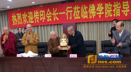 参观结束后,传印会长在阳光楼多功能厅亲切会见了藏语系高级佛学院的全体师生。藏语系高级佛学院学僧代表向传印会长一行敬献了哈达;传印会长代表中国佛教协会和中国佛学院,向藏语系高级佛学院的全体师生致以亲切的问候,并向中国藏语系高级佛学院赠送了佛像。
