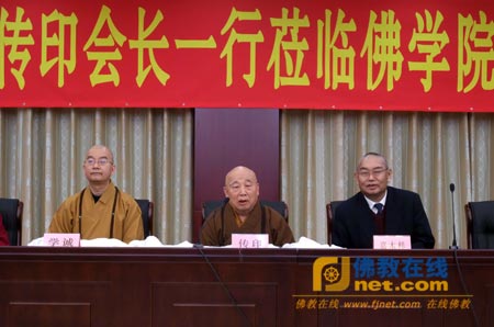 传印会长对藏语系高级佛学院的热情接待表示衷心感谢。传印会长表示,刚刚参观了藏语系高级佛学院新落成的教学楼,并听取了杨坚赞副院长所作的学院工作报告,我们深受鼓舞。在党中央和中央统战部的亲切关怀下,藏语系高级佛学院在校舍建设、佛教教学、僧才培养等方面取得了令人瞩目的成就,值得全国佛教界学习和借鉴。我国佛教界有着爱国爱教的优良传统,中国藏语系高级佛学院作为藏传佛教各教派僧人学习的最高学府,自1987年创立以来,为藏区培养了大批爱国爱教的优秀宗教人才,为维护祖国统一和稳定作出了重要的贡献。今年召开的中共十七届六中全会作出了推动 “文化大发展大繁荣”的决定,指出要“发挥宗教界人士和信教群众在促进文化繁荣发展中的积极作用”。佛教文化是中华传统文化的重要组成部分,在“文化大发展大繁荣”背景下,佛教将大有作为,前景非常光明。祝愿藏语系高级佛学院在2012年取得更好的成绩。