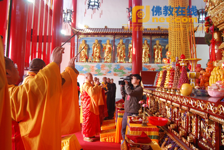 上午10时18分,松纯长老等诸山长老一行为全堂佛像洒净开光。