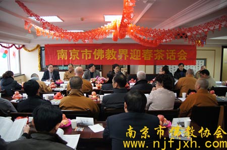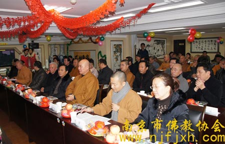 2012年1月18日下午,南京市佛教协会在随园大厦会址召开2012年迎新春茶话会。南京市人大民宗侨外委朱淮宁主任,南京市民宗局李兰局长、宗志清副局长,南京市政协社法委徐福华主任、卢正生副主任,江苏省佛教协会副会长、南京市佛教协会会长隆相法师,江苏省佛教协会副会长、南京市佛教协会副会长兼秘书长莲华法师,市佛协各位副会长、有关寺院负责人,南京市各区县民宗局局长应邀参加了茶话会。