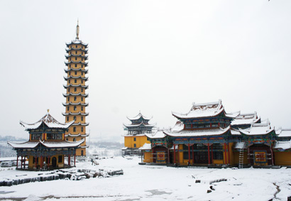山东博山正觉寺宝塔、药师七佛殿、钟楼、六和楼的雪景(图片来源:资料图)