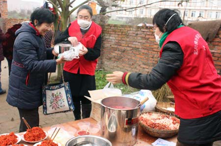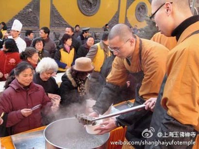 玉佛禅寺秉承佛教“无缘大慈,同体大悲”精神,上报四重恩,下济三涂苦,与上海市老年基金会联合于2012年1月1日(农历腊月初八)上午9:00在玉佛禅寺安远路山门前举办“品尝美味腊八粥,共享和谐吉祥年”2012迎新年腊八赠粥活动,与大众同享欢乐,喜迎新年。(来源:上海玉佛禅寺)