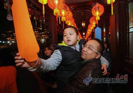 一位市民正带着自己的孩子在龙华寺灯谜长廊内猜灯谜迎新年(图片来源:东方网)