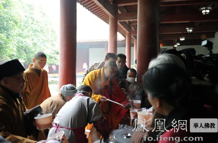 编者按:“腊八”指农历十二月八日。在我国近世佛教界,这一天被视为释迦牟尼佛成道日。是日清晨,各寺院均以果品、五谷煮粥供佛及僧,并以之饷诸信徒,腊八日举行的法会,称为成道会、成道节、佛成道日、腊八会。这一习俗逐渐在民间流布,遂演变成为民间习俗。机缘巧合,2012元旦正值腊八,各地佛寺都有免费施粥的活动,重庆华岩寺腊八施粥活动还上了重庆市非物质文化遗产名录。那么,新的一年就从热腾腾、香喷喷的腊八粥开始吧。在此,凤凰网华人佛教祝全球华人新年快乐、吉祥平安!