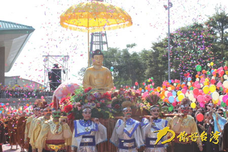 报道称,接着举行游佛活动,两岸108位法师随侍佛陀圣像绕场,少数民族舞乐欢庆,信众不断挥洒五彩花瓣,彷若佛陀再世,游化人间。