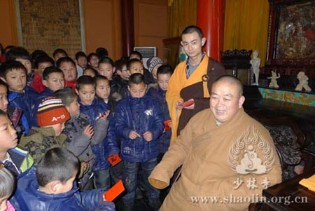 当日晚,少林慈幼院的孩子们和僧众到方丈室,和永信法师共度除夕,永信法师为孩子们发放了过年的红包。24点整,少林慈幼院的孩子们和来自全国各地的信众,在方丈永信法师的带领下,敲响了新春的钟声。