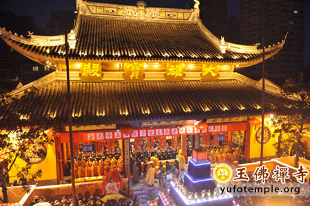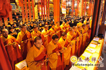 2012年1月31日(农历正月初九)清晨6:00,上海玉佛禅寺“壬辰新春供佛斋天祈福大法会”在寺内举行。前院丹墀中央,供台高矗,供品齐全,数千信众齐聚大雄宝殿前,场面庄严、清净而隆重。