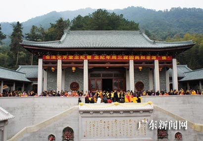 中国佛教协会副会长净慧老和尚、纯一大和尚等海内外66位高僧名师为纪念堂落成开光剪彩。(图片来源:广东新闻网 摄影:李凌)