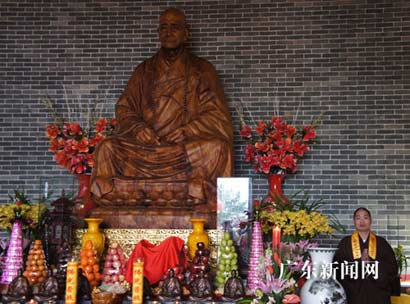 纪念堂内两米多高的佛源老和尚坐像,由曾埋藏地下4万多年的古木雕刻而成。(图片来源:广东新闻网 摄影:李凌)